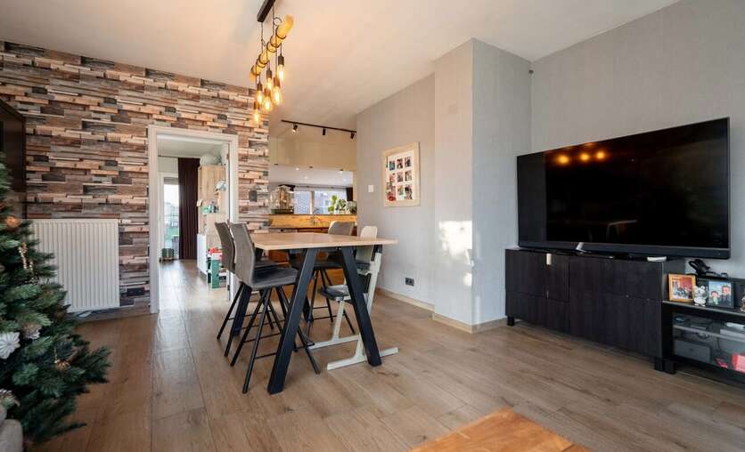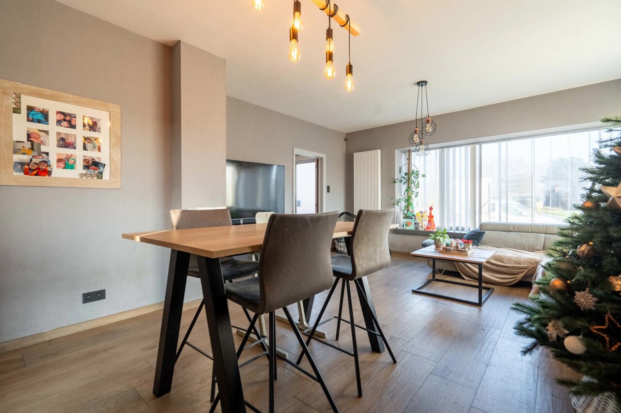 Deze leidt ons tot de gezellig leefruimte en zithoek dewelke genieten van een aangename lichtinval.